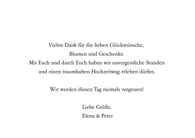 Personalisiere ganz einfach deine Hochzeits-Dankeskarten und gib ihnen deinen eigenen Stil. Dankeskarten zur Hochzeit sind ausserdem eine wunderbare Erinnerung an das tolle Event. Nicht nur Gaeste sondern auch andere Mitwirkende wie beispielsweise die Standesbeamtin der Priester oder das Personal vom Caterer freuen sich ebenfalls ueber einen kleinen Dank fuer Ihr Engagement.